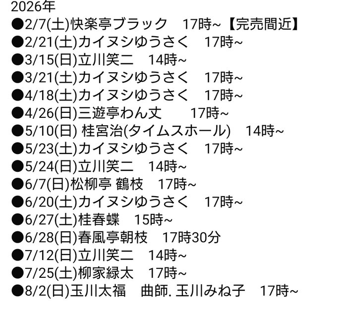 2026年の花園寄席のスケジュールです。新たなスケジュールが追加されることもありますので、気になる方は花園寄席のSNSをチェックしてください!