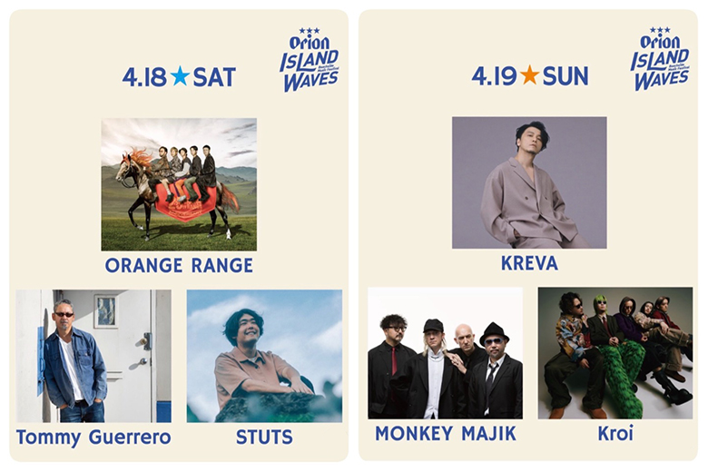 「Orion Island Waves」は、豪華なアーティストが集結します!1日目となる4月18日(土)には、ORANGE RANGE、Tommy Guerrero、STUTSが。2日目となる4月19日(日)には、KREVA、MONKEY MAJIK、Kroiが。こ今後も様々なアーティストが加わる予定です!お楽しみに!