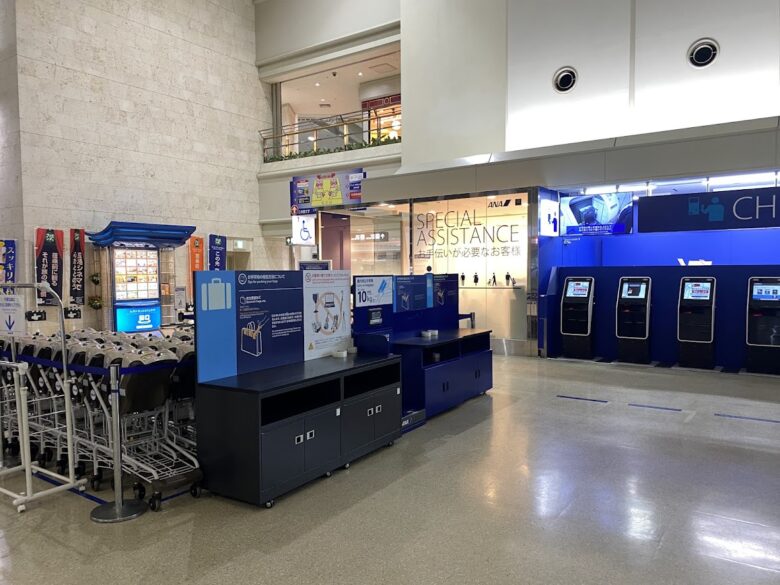 那覇空港3F出発ロビーの全日空側にあります。右側手前が全日空カウンター、左側奥が日本航空側カウンターになります。
