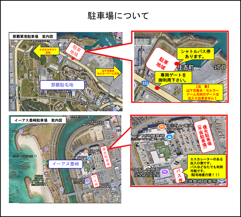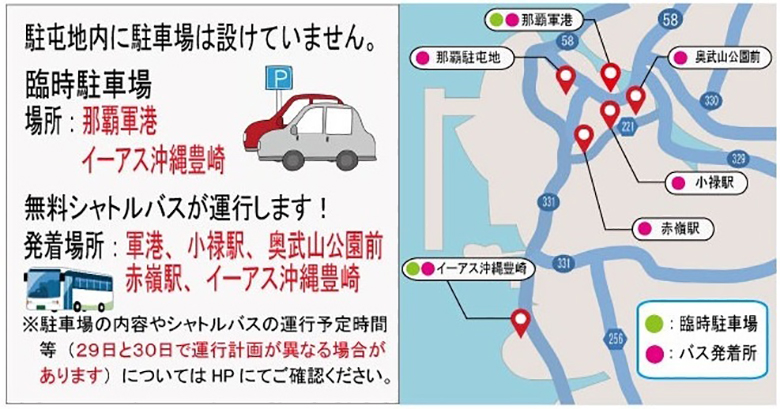 ・無料シャトルバス発着場所:軍港、小禄駅、奥武山公園前、赤嶺駅、イーアス沖縄豊崎/運行時間:8:00~15:30(20分毎)