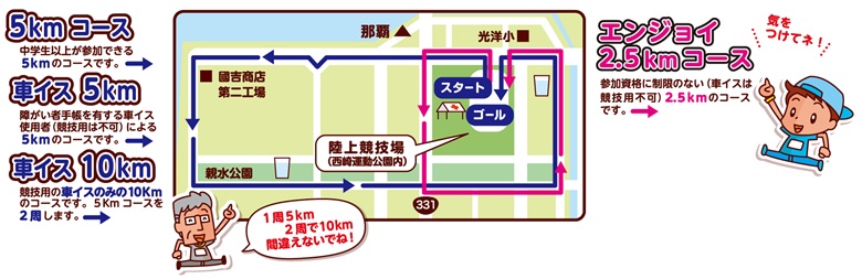 5kmコースは、中学生以上が参加できるコース。車イス5kmコースは、障がい者手帳を有する車イス使用者(競技用は不可)によるコース。車イス10kmコースは、競技用の車イスのみのコースでm5kmのコースを2周します。エンジョイ2.5kmコースは、参加資格に制限のない(車イスは競技用不可)のコースです。