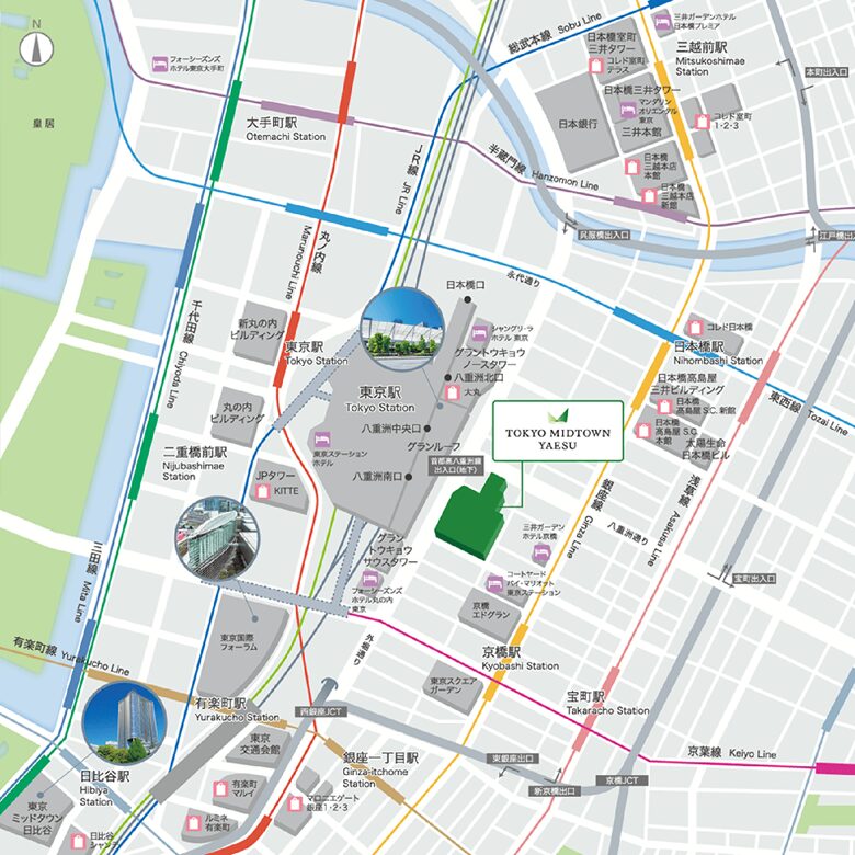 JR「東京」駅 地下直結(八重洲地下街経由)、東京メトロ丸の内線「東京」駅 地下直結(八重洲地下街経由)