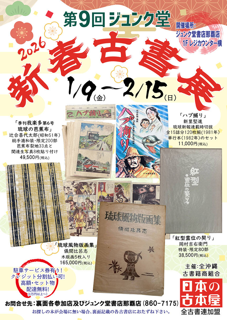 2026年1月9日(金)〜2月15日(日)の期間中、新春恒例となった「第9回ジュンク堂新春古書店」が、ジュンク堂書店那覇店1Fレジカウンター横にて開催されます。本屋さんで古本を売るって斬新ですよね。しかも沖縄好きのハートをくすぐる沖縄本の古本が山ほど販売されます。お気に入りの沖縄本を見つけてくださいね。関連イベントでは深い話が聞けるかも!