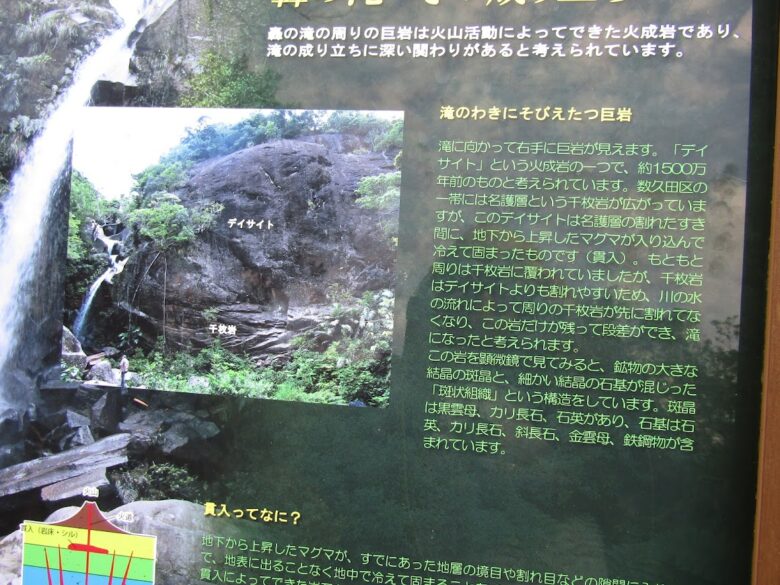轟の滝の右手にある大きな一枚岩。「デイサイト」と呼ばれる火成岩の一つで、約1500万年前のものと推測されます。