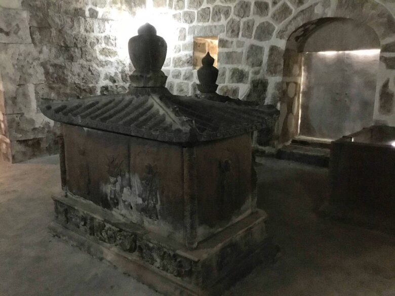 浦添グスク・ようどれ館には、浦添ようどれの内部を実物大で再現しています。写真は厨子と呼ばれる、いわゆる骨壺です。この中に王が眠っていることになります。