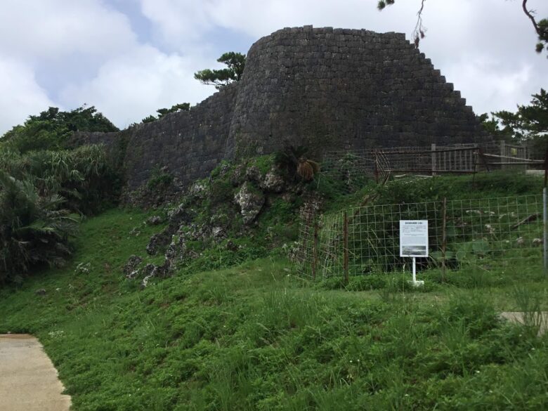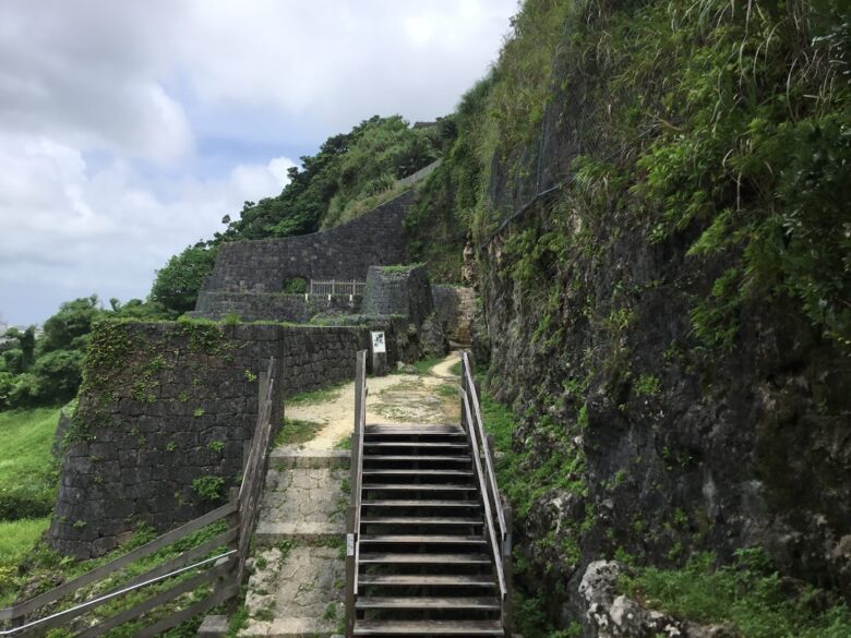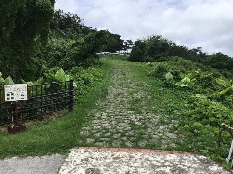 浦添大公園南エントランスから浦添城跡に入っていきましょう。この道は首里城につながる石畳道があった場所で、写真で見られる上部の方に一部残されています。