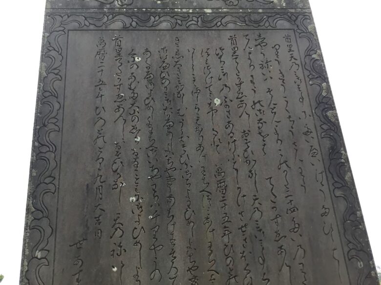 石畳を整備した際の竣工記念碑です。表は写真のようにひらがなの琉球文で、裏は漢文で書かれています。尚寧王の命で国民が力を合わせて石を積み道路を作ったと記されています。