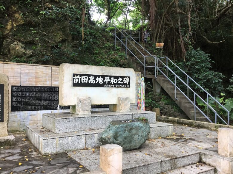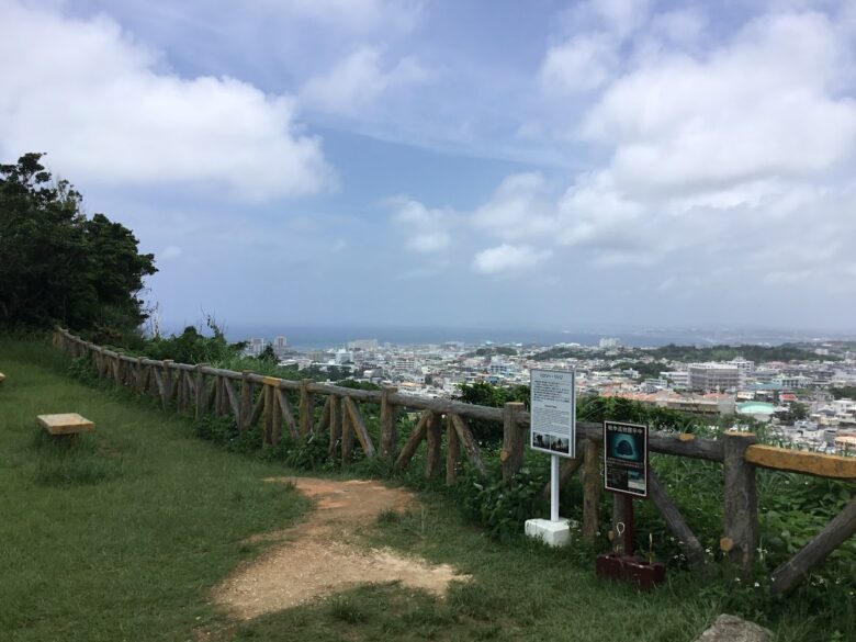 浦添城と言っても、こちらから入るとお城らしくは感じません。このように芝生の広場が広がっています。沖縄戦の際には「前田高地」(米軍からはハクソー・リッジ)と呼ばれた場所で、約3週間、11回にわたり米軍と日本軍が戦った場所です。